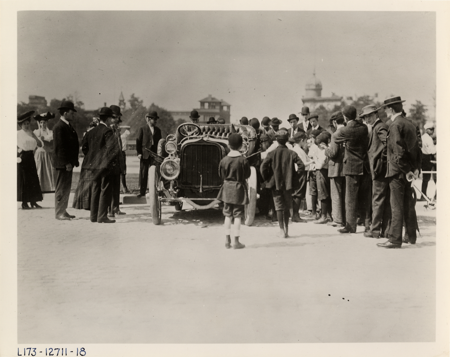 Crowd gathering around automobile, 1906 Long Island Automobile Club parade