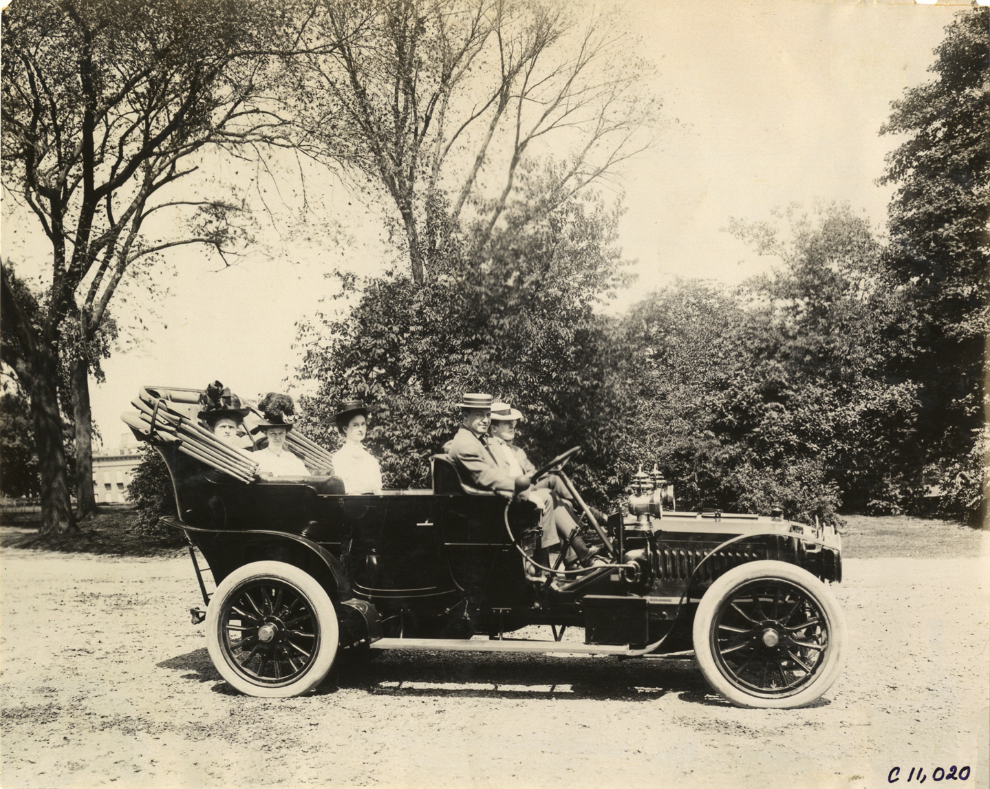 View of motorists in 1908 Panhard car. Handwritten on back: "Panhard, 1908."
