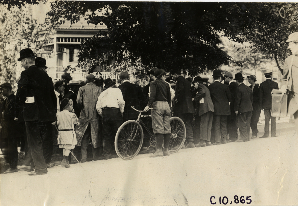 View of group of spectators on roadside at 1909 New York Motorcycle Club spring run through Brooklyn and Long Island, New York. Boy with bicycle in foreground; wooden-frame house in background. Handwritten on back: "Motorcycle races--New York Motorcycle Club spring run, 1909."