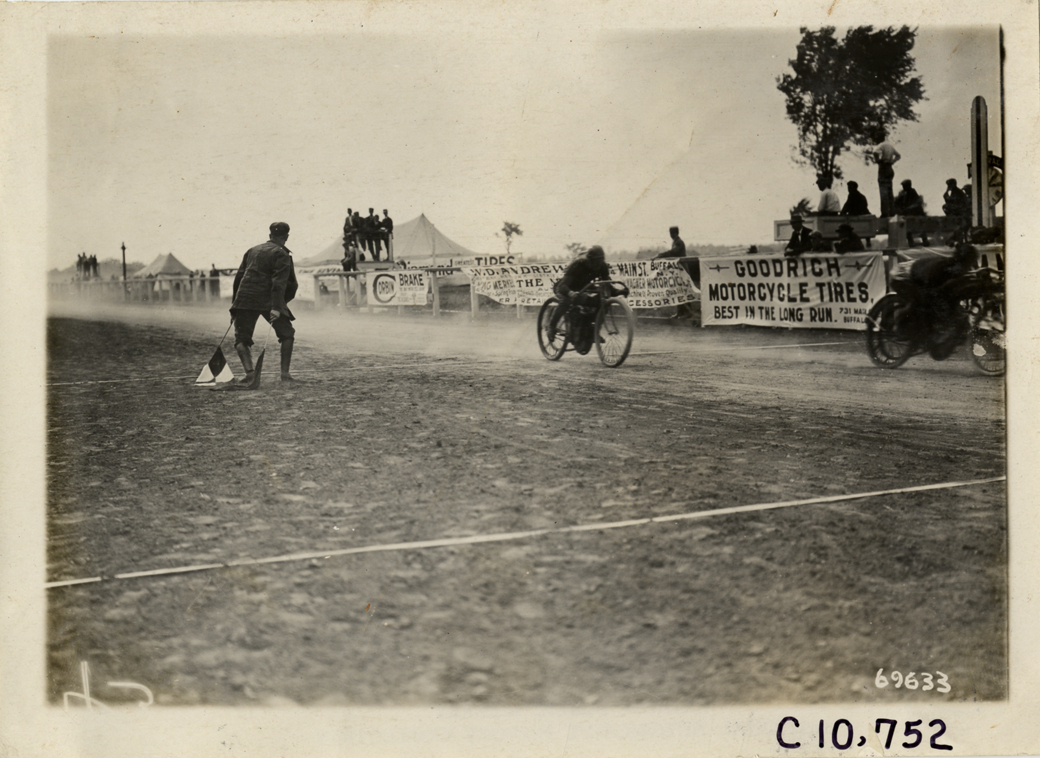 View of motorcyclists Arthur Chapple and M.J. Graves crossing finish line in race during 1911 Federation of American Motorcyclists races in Fort Erie, Ontario. Official waves flags at finish line; spectators in background. Corbin brake and Goodrich motorcycle tires banners on racetrack railing. Stamped on back: "Spooner & Wells, Inc., photographers, telephones 3472-3473 Columbus, 1931 Broadway, New York." Handwritten on back: "Motorcycle races--Federation of American Motorcyclists championship races, 1911. Chapple & Graves."