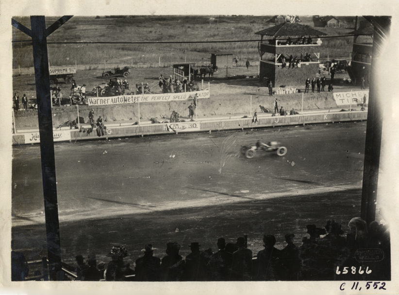 View from grandstand of automobile race at Atlanta Speedway in Georgia. Timers' stand and spectators in background. "Warren Auto-Meter, the perfect speed indicator," "Michelin tires," and "Supreme auto oil" banners in background. Printed on front: "Spooner, Wells." Stamped on back: "Spooner & Wells, Inc., photographers, telephones 3472-3473 Columbus, 1931 Broadway, New York." Handwritten on back: "Races and racing--Atlanta Speedway races, 1910."
