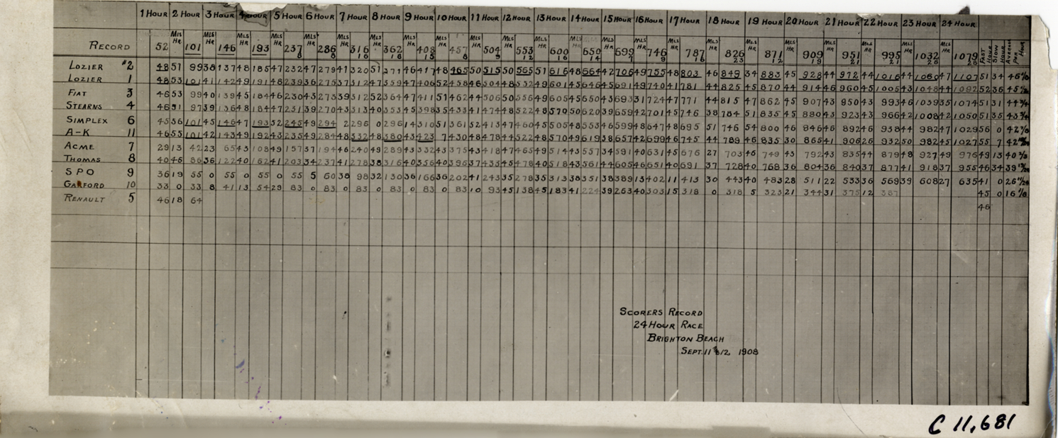 View of scorer's record for 1908 Brighton Beach 24-hour race. Printed on front: "Scorers record, 24 hour race, Brighton Beach, Sept. 11 and 12, 1908." Handwritten on back: "Races and racing--Brighton Beach, 1908."