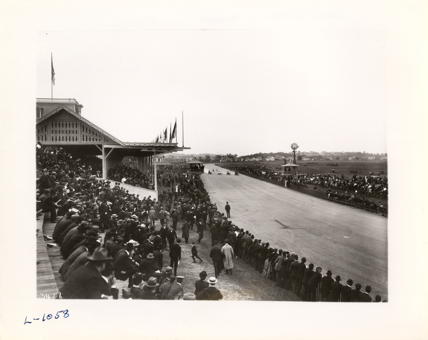 View of crowd watching automobile race at Providence, Rhode Island racetrack. Grandstand on left; reviewing stand on right. Handwritten on back: "Race courses. Providence, 1903."