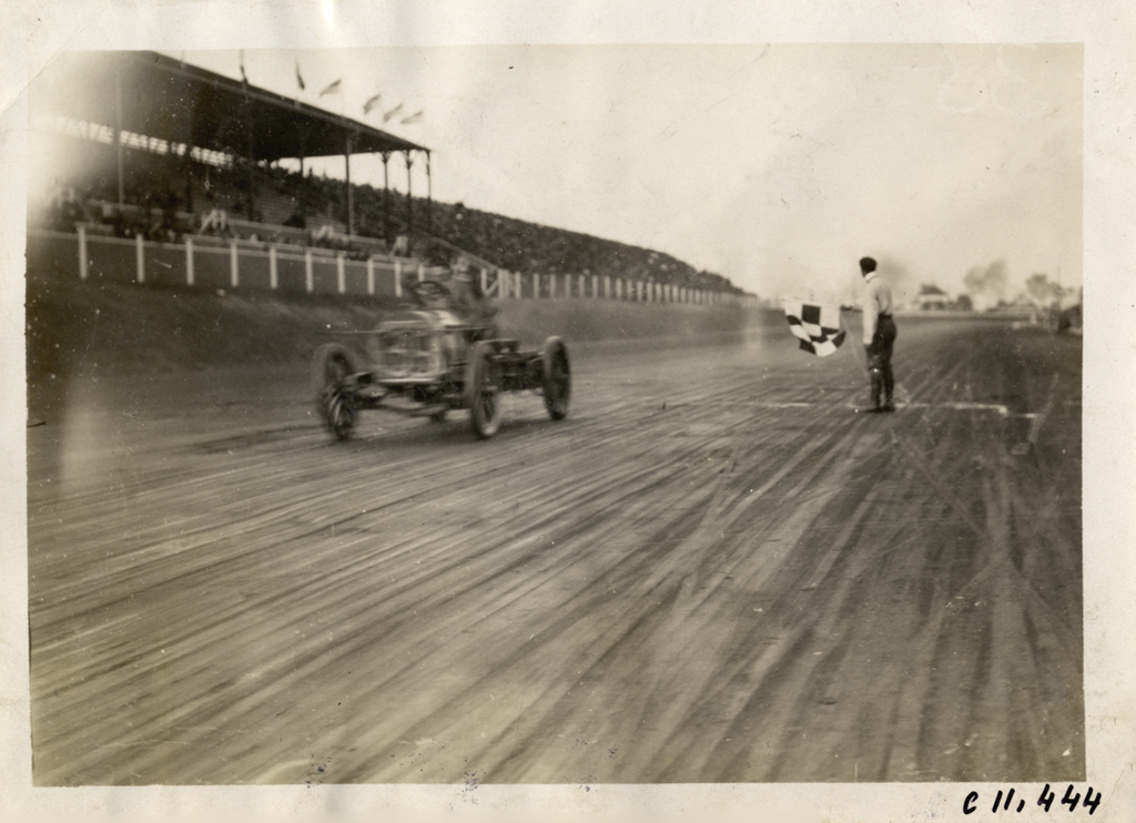 View of Jack Rutherford in Stearns racecar no. 35 crossing finish line at Atlanta Speedway in Georgia. Official waves checkered flag; grandstand in background. Stamped on back: "Spooner & Wells, Inc., photographers, telephones 3472-3473 Columbus, 1931 Broadway, New York." Handwritten on back: "Races and racing--Atlanta Speedway races, 1909. Jack Rutherford in the Stearns at the wheel, winner of 10 mile race at Atlanta."