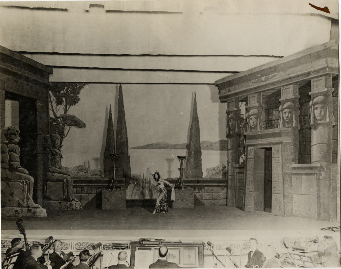 View of an actress, wearing belly-dancing costume, on stage during scene of unidentified play. Egyptian temple scenery and props on stage; orchestra in pit. Handwritten on back: "Plays, 1908."