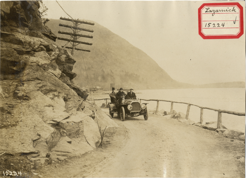 View of motorists in 1907 Peerless car traveling on road next to lake, between rocks and rustic railing. Label on front: "Lazarnick. 15224." Stamped on back: "Photo by N. Lazarnick, 29 West 42nd Street, New York." Handwritten on back: "Peerless, 1907."
