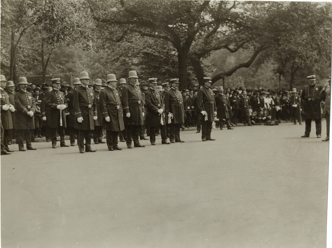 View of police officers standing in formation during 1906 parade honoring New York Police Department. Handwritten on back: "Parades--New York policeman's parade, 1906."
