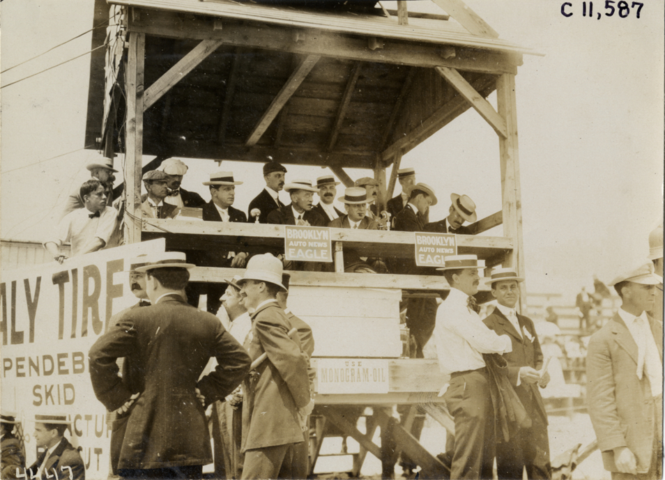 View of men in reviewing stand during automobile race at Atlantic City, New Jersey. Stamped on back: "Photo by N. Lazarnick, 29 West 42nd Street, N.Y., tel. 594 Bryant." Handwritten on back: "Races and racing--Atlantic City, 1907."