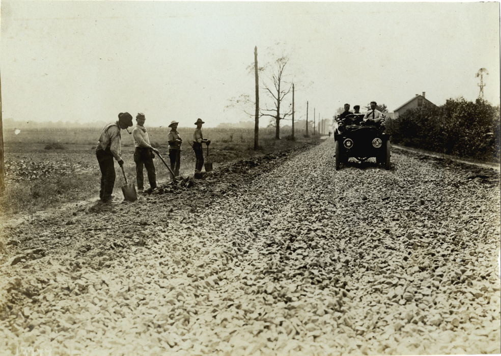 View of motorists in car traveling past men working on rural road, part of the 1906 Vanderbilt Cup race course on Long Island, New York. Handwritten on back: "Race courses--Vanderbilt Cup, 1906."