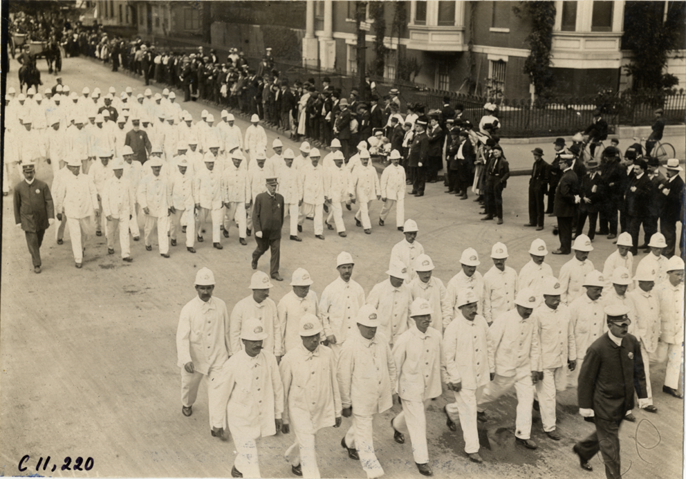 Street cleaners marching in formation, 1909 New York street cleaners parade