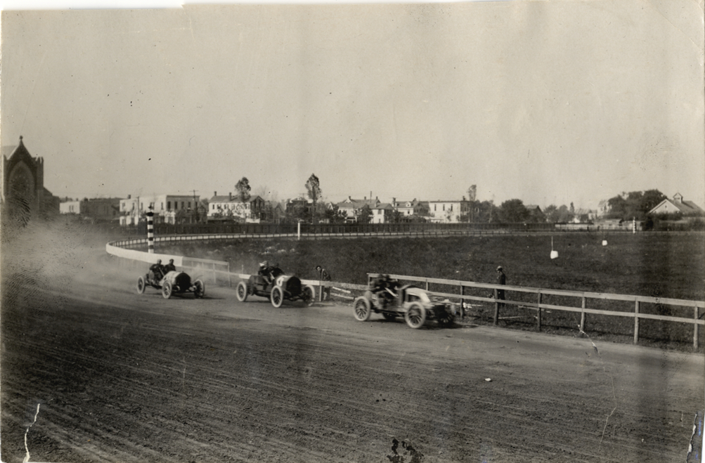 View of three racecars on track during 1908 Brighton Beach races in New York. Stamped on back: "Spooner & Wells, Inc., photographers, telephones 3472-3473 Columbus, 1931 Broadway, New York." Handwritten on back: "Races and racing--Brighton Beach, 1908."