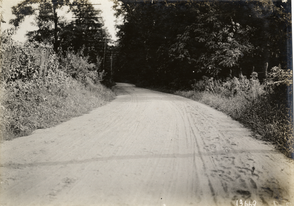 View of tree-lined rural dirt road, part of the 1906 Vanderbilt Cup race course on Long Island, New York. Handwritten on back: "Race courses--Vanderbilt Cup, 1906."