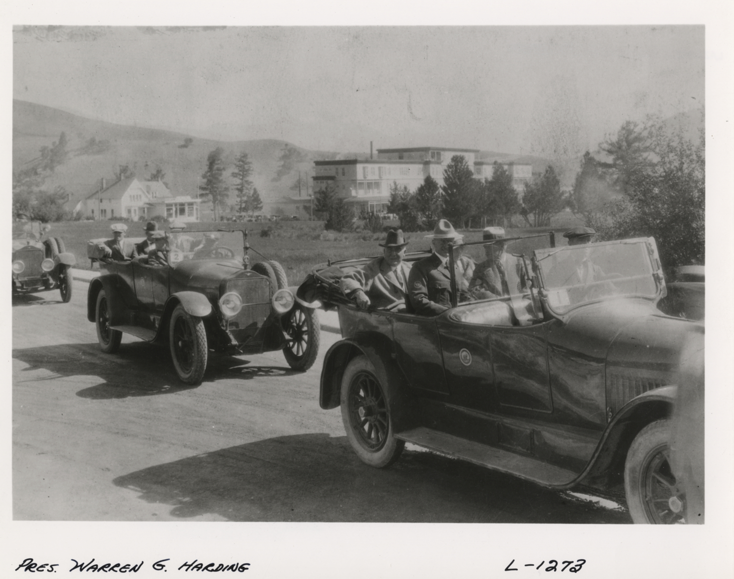 View of President Warren G. Harding riding with other passengers in car, followed by second car. Handwritten on front: "Pres. Warren G. Harding." Handwritten on back: "Personalities. President Warren G. Harding."