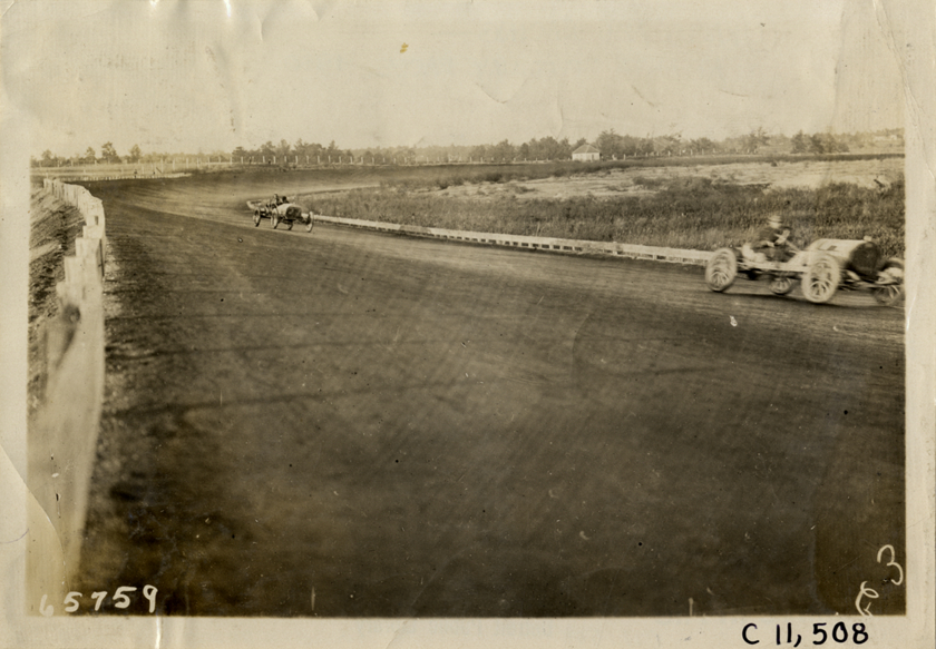 View of automobile race at Atlanta Speedway in Georgia. Stamped on back: "Spooner & Wells, Inc., photographers, telephones 3472-3473 Columbus, 1931 Broadway, New York." Handwritten on back: "Races and racing--Atlanta Speedway races, 1910."