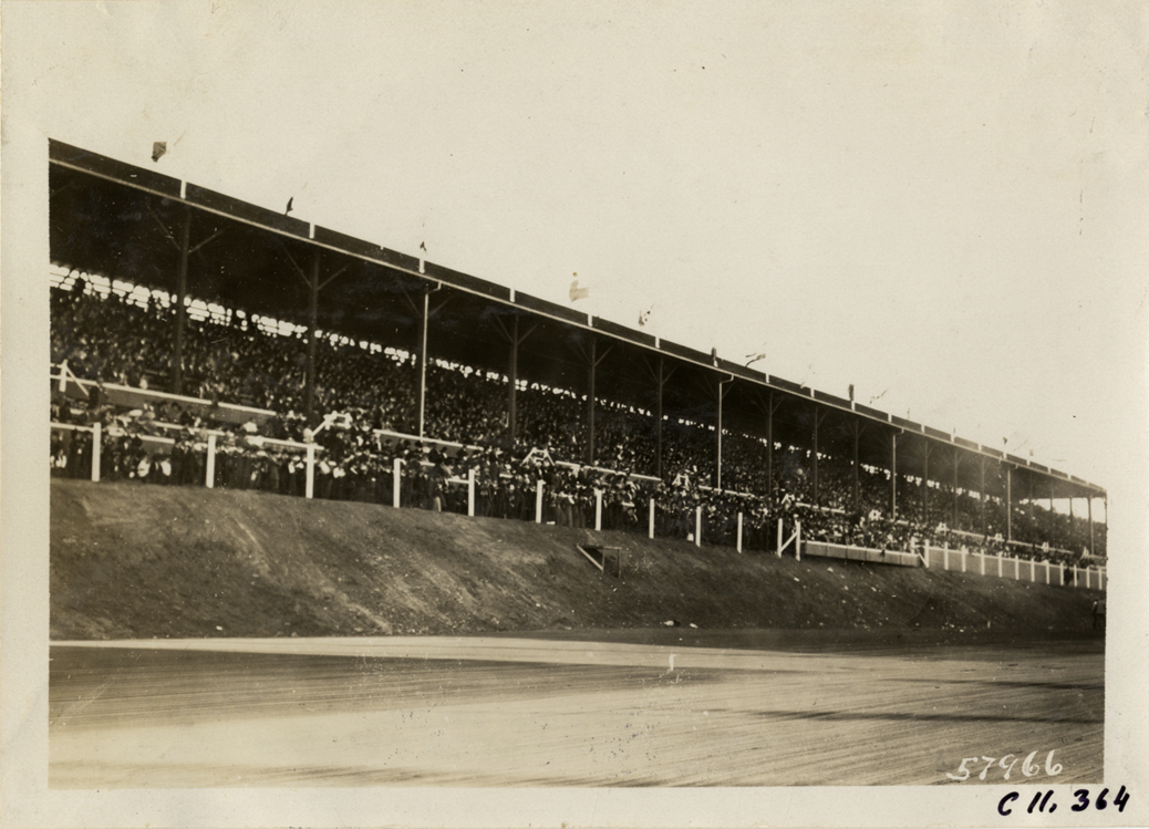 View of spectators in grandstand during automobile race at Atlanta Speedway in Georgia. Stamped on back: "Spooner & Wells, Inc., photographers, telephones 3472-3473 Columbus, 1931 Broadway, New York." Handwritten on back: "Races and racing--Atlanta Speedway races, 1909."