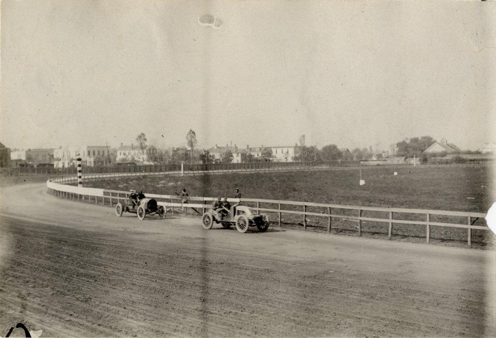 View of two racecars on track during 1908 Brighton Beach races in New York. Stamped on back: "Spooner & Wells, Inc., photographers, telephones 3472-3473 Columbus, 1931 Broadway, New York." Handwritten on back: "Races and racing--Brighton Beach, 1908."