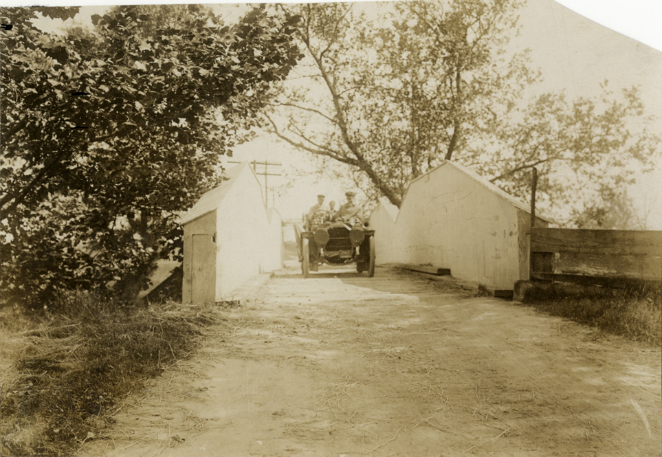 View of motorists in 1907 Peerless car crossing over bridge. Stamped on back: "Photo by N. Lazarnick, 29 West 42nd Street, New York." Handwritten on back: "Peerless, 1907. F4075."