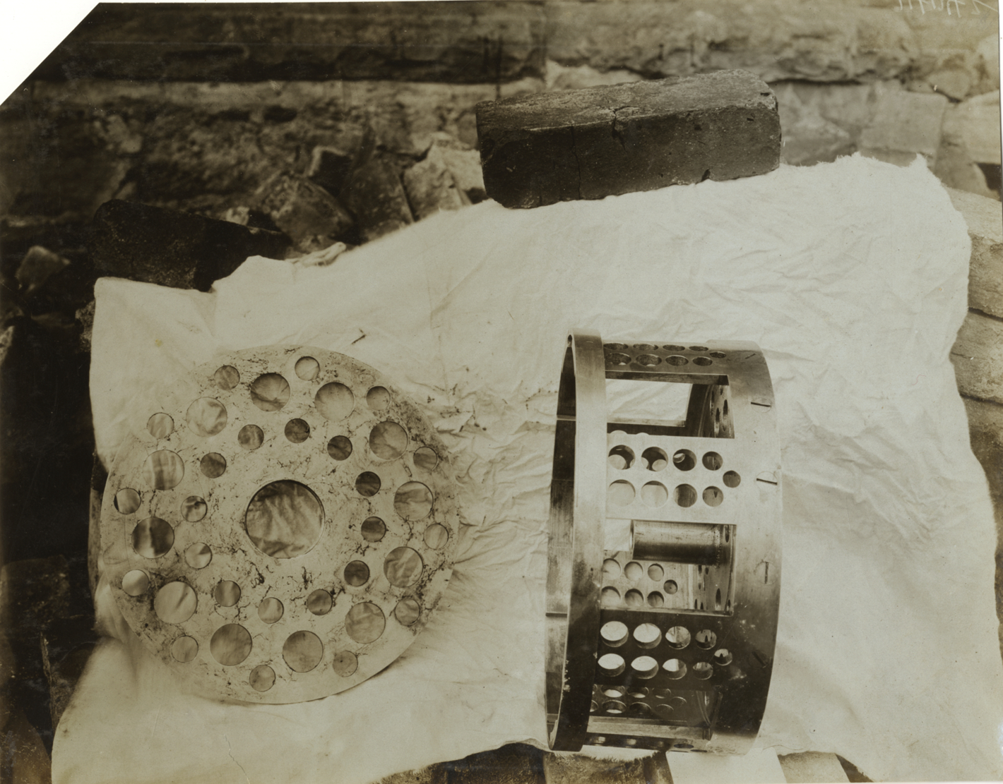 View of unidentified parts for car, resting on backdrop. Handwritten on back: "Parts--Miscellaneous, 1907."