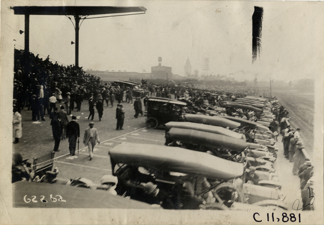 View of spectators and row of cars parked on sidelines of racetrack during 1910 Brighton Beach races in New York. Portion of grandstand visible in background. Stamped on back: "Spooner & Wells, Inc., photographers, telephones 3472-3473 Columbus, 1931 Broadway, New York." Handwritten on back: "Races and racing--Brighton Beach, 1910."