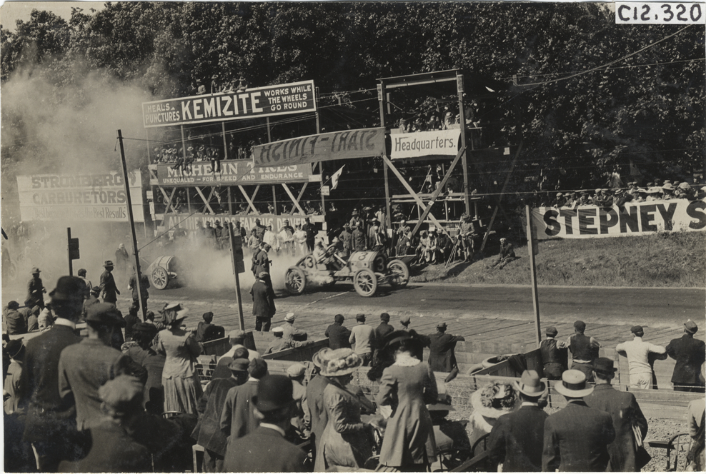 View of Joseph Seymour in Apperson car no. 3 parked in front of group of spectators in stands during the 1909 Crown Point races in Indiana. "Start-Finish" banner suspended over road; "Kemizite heals punctures, works while the wheels go round," "Michelin tires," "Headquarters," "Stepney" and "Stromberg carburetors" signs displayed on stands. Pits in foreground. Stamped on back: "Spooner & Wells, Inc., photographers, telephones 3472-3473 Columbus, 1931 Broadway, New York." Handwritten on back: "Start #3, Seymour, Apperson. Races and racing--Crown Point races, 1909."