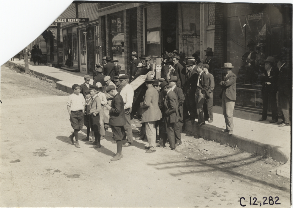 View of men, women and boys waiting on side of road in front of commercial buildings during the 1909 Crown Point races in Indiana. Sign for "Pierce's Restaurant" in background. Stamped on back: "Spooner & Wells, Inc., photographers, telephones 3472-3473 Columbus, 1931 Broadway, New York." Handwritten on back: "Races and racing--Crown Point races, 1909."