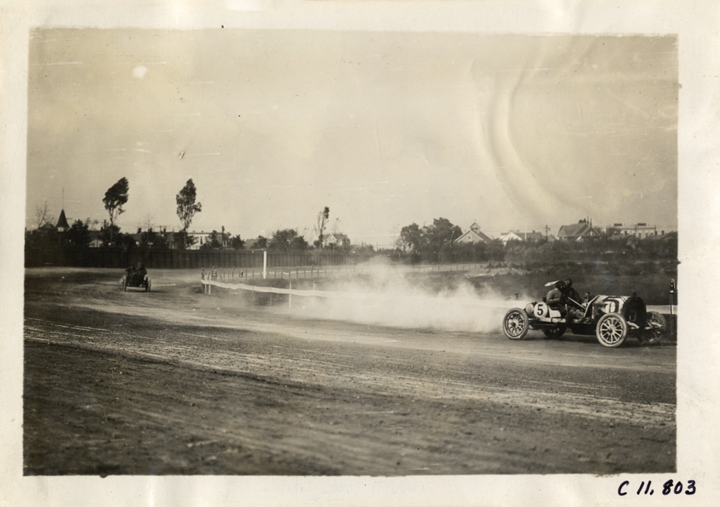 View of two cars racing on track during 1909 Brighton Beach races in New York. Racecar no. 5 in lead. Stamped on back: "Photo by Spooner & Wells, Inc. 1931 Broadway, N.Y." Handwritten on back: "Races and racing--Brighton Beach, 1909."