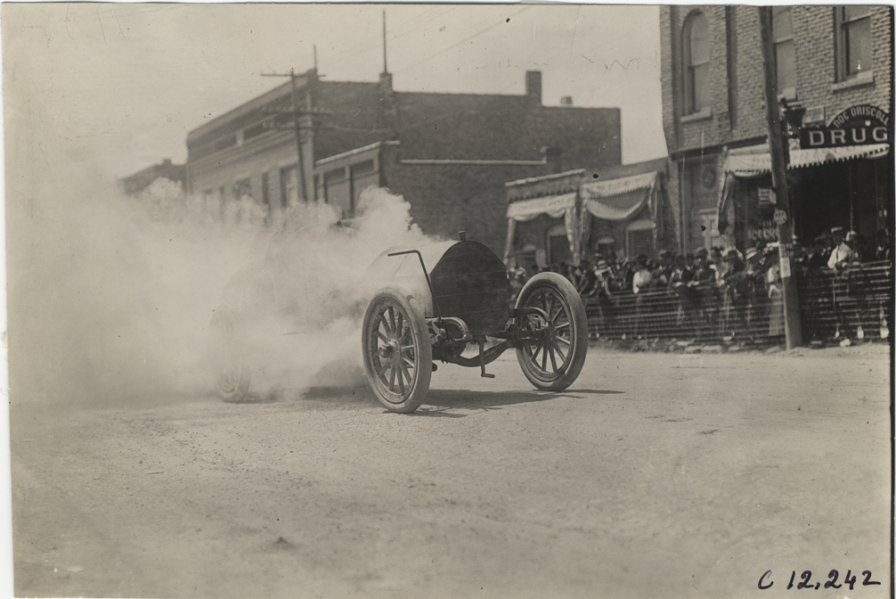 View of racecar, partially obscured by smoke, in middle of road during the 1909 Crown Point races in Indiana. Spectators watch from sidewalk in front of commercial buildings. Stamped on back: "Spooner & Wells, Inc., photographers, telephones 3472-3473 Columbus, 1931 Broadway, New York." Handwritten on back: "Races and racing--Crown Point races, 1909."