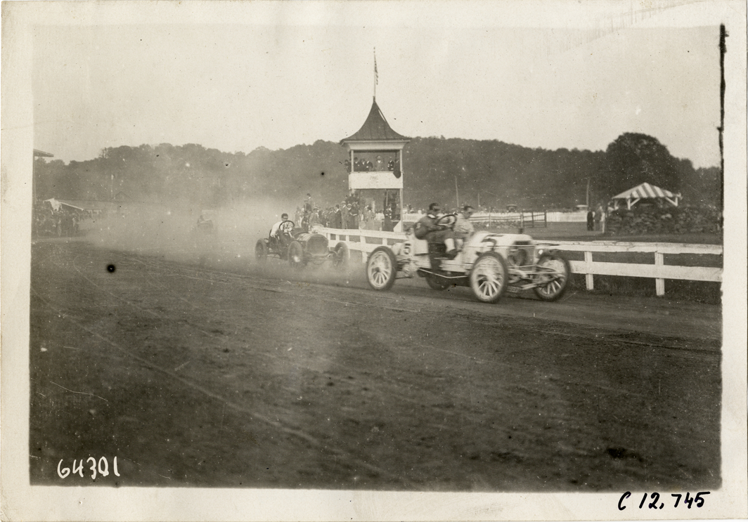 View of two cars racing on track at the Empire City track in Yonkers, New York. Car no. 5 in lead; judge's or reviewing stand in background. Stamped on back: "Spooner & Wells, Inc., photographers, telephones 3472-3473 Columbus, 1931 Broadway, New York." Handwritten on back: "Races and racing--Empire City races, 1910."