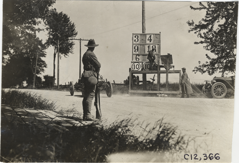 View of soldier with rifle, watching racecar from side of road during the 1909 Crown Point races in Indiana. Man stands on platform in front of scoreboard in background. Stamped on back: "Spooner & Wells, Inc., photographers, telephones 3472-3473 Columbus, 1931 Broadway, New York." Handwritten on back: "Races and racing--Crown Point races, 1909."