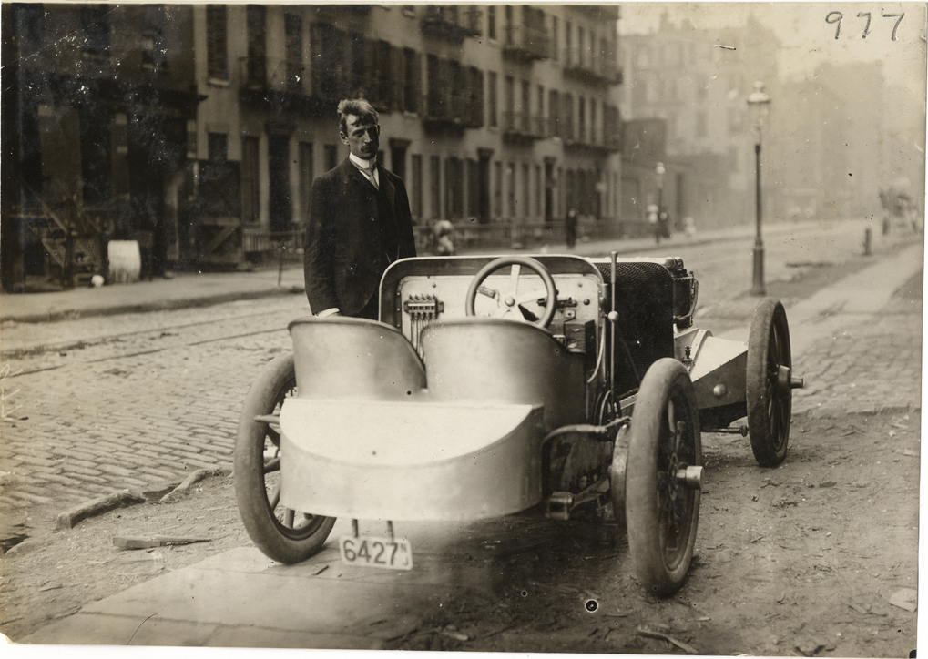 View of J. Walter Christie standing next to 1904 Christie racer. Handwritten on back: "Christie, 1904."