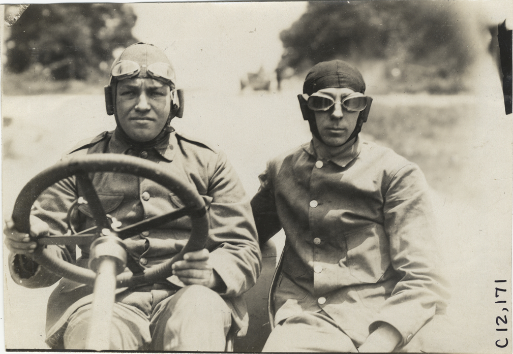 George Robertson and passenger in racecar, 1909 Crown Point races