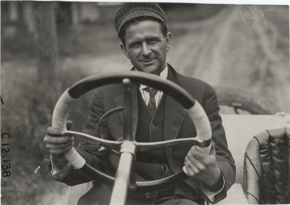 Close-up view of George DeWitt posing in car during the 1909 Crown Point races in Indiana. Stamped on back: "Spooner & Wells, Inc., photographers, telephones 3472-3473 Columbus, 1931 Broadway, New York." Handwritten on back: Geo. DeWitt. Races and racing--Crown Point races, 1909."