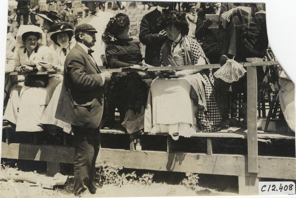 Close-up view of men and woman sitting in bleachers during the 1909 Crown Point races in Indiana. Stamped on back: "Spooner & Wells, Inc., photographers, telephones 3472-3473 Columbus, 1931 Broadway, New York." Handwritten on back: "Races and racing--Crown Point races, 1909."