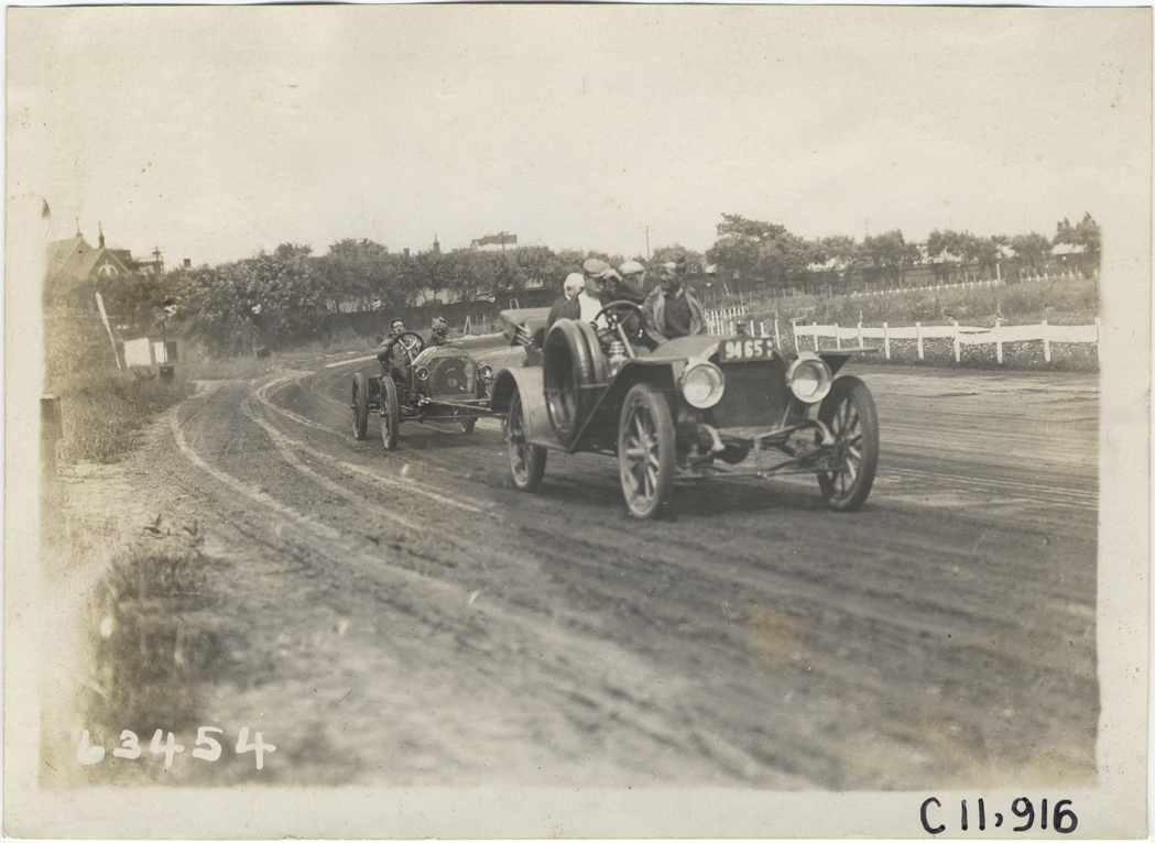 Automobile towing racecar around track, 1910 Brighton Beach races