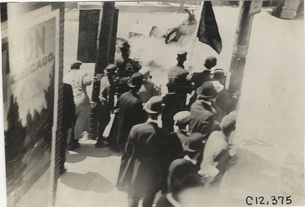 Rear view of spectators watching racecar from sidewalk corner during the 1909 Crown Point races in Indiana. Stamped on back: "Spooner & Wells, Inc., photographers, telephones 3472-3473 Columbus, 1931 Broadway, New York." Handwritten on back: "Races and racing--Crown Point races, 1909."