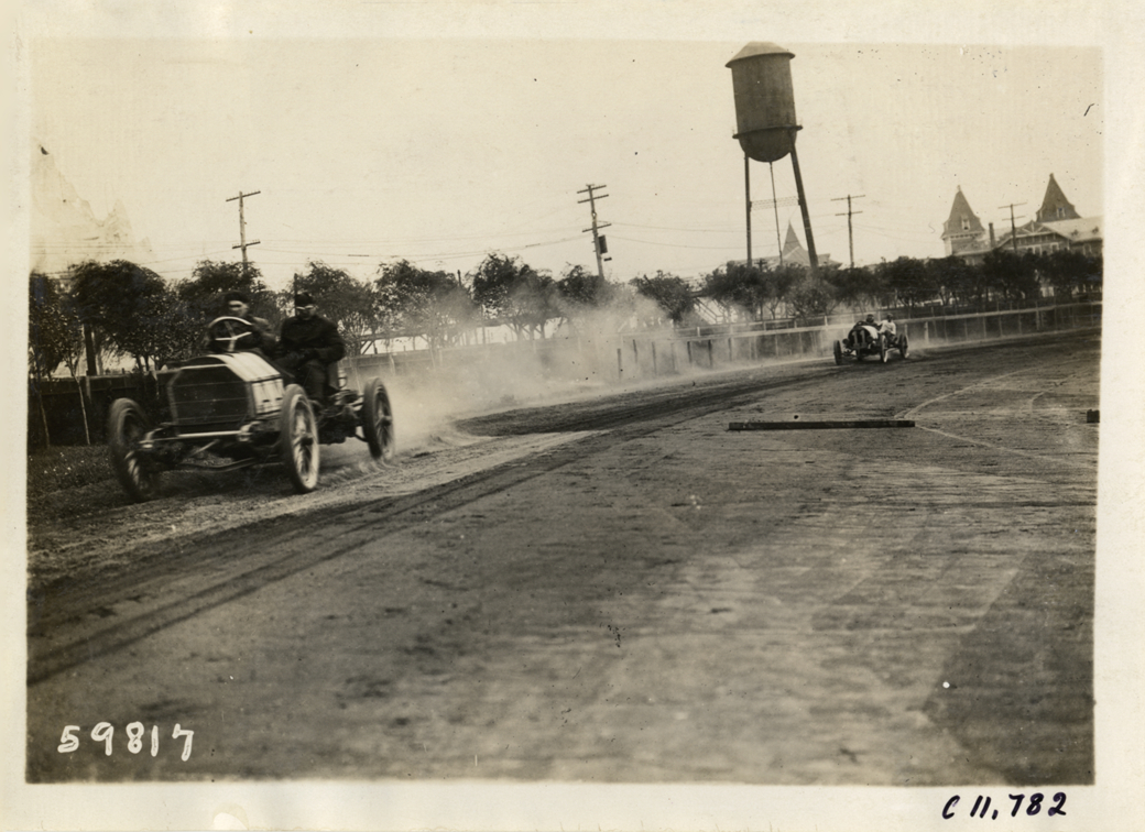 View of two racecars on track during 1909 Brighton Beach races in New York. Handwritten on back: "Races and racing--Brighton Beach, 1909."