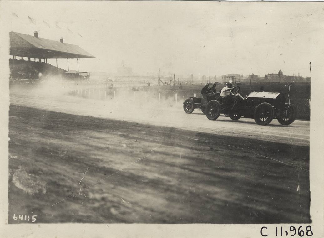View of two cars racing on track during 1910 Brighton Beach races in New York. Stamped on back: "Spooner & Wells, Inc., photographers, telephones 3472-3473 Columbus, 1931 Broadway, New York." Handwritten on back: "Races and racing--Brighton Beach, 1910."