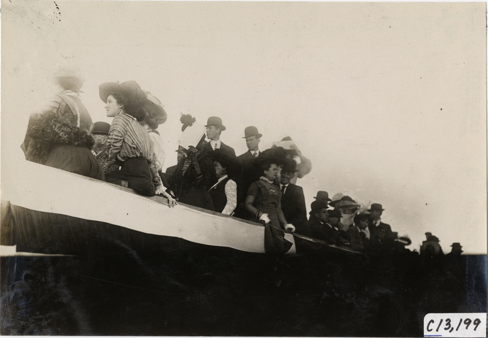 Close-up view of spectators during the 1908 Grand Prize races in Savannah, Georgia. Handwritten on back: "Races and racing--Grand Prize races, 1908."