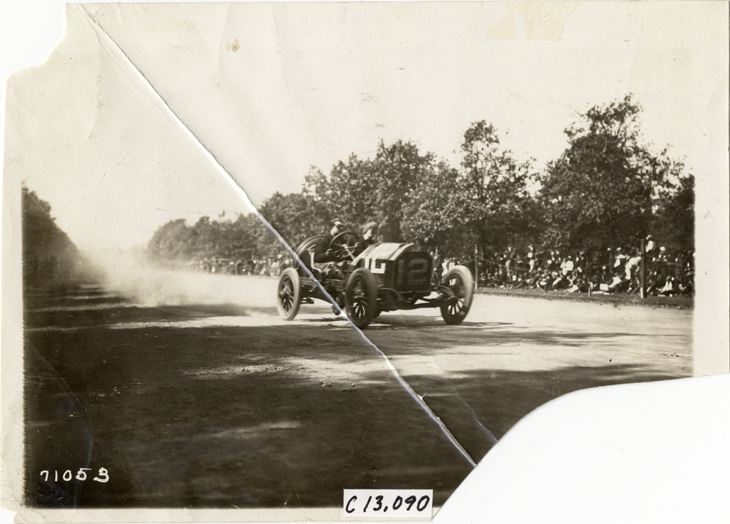 View of George Parker and passenger racing Ohio car no. 12 on course during the 1911 Fairmount Park races in Philadelphia, Pennsylvania. Spectators watch from roadside. Stamped on back: "Spooner & Wells, Inc., photographers, telephones 3472-3473 Columbus, 1931 Broadway, New York." Handwritten on back: "Parker, Ohio car, Div. 3. Races and racing--Fairmount Park races, 1911."