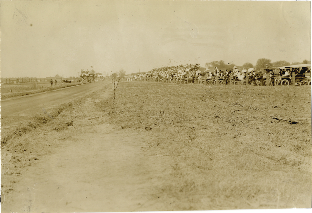 View of spectators on roadside during the 1908 Grand Prize races in Savannah, Georgia. Handwritten on back: "Races and racing--Grand Prize races, 1908."