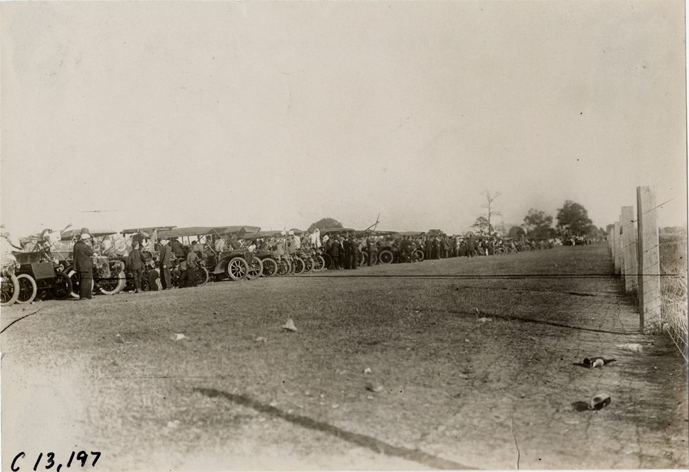 View of spectators with their cars on roadside during the 1908 Grand Prize races in Savannah, Georgia. Handwritten on back: "Races and racing--Grand Prize races, 1908."