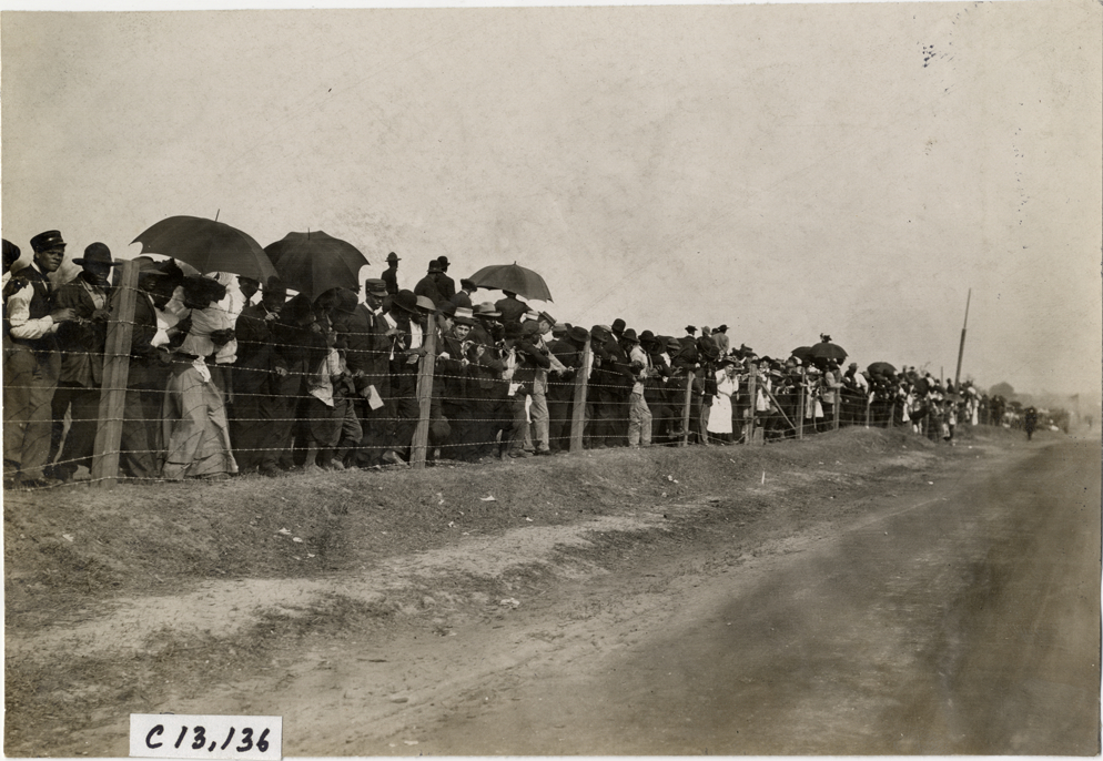 View of spectators, some holding umbrellas, standing behind fence during the 1908 Grand Prize races in Savannah, Georgia. Stamped on back: "Photo by N. Lazarnick, 29 West 42nd Street, N.Y., tel. 594 Bryant." Handwritten on back: "Races and racing--Grand Prize races, 1908."
