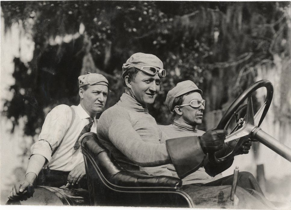 Close-up view of George Salzman, George Robertson and unidentified man in Thomas car during the 1908 Grand Prize races in Savannah, Georgia. Handwritten on back: "Salzman, Robertson, 6 cyl. Thomas. Races and racing--Grand Prize races, 1908."