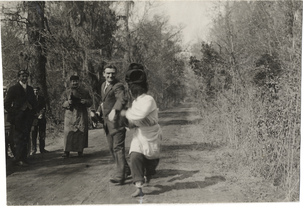 View of group of motorists approaching a woman walking on rural road during the 1908 Grand Prize races in Savannah, Georgia. Woman wears long tunic and large hat. Handwritten on back: "Races and racing--Grand Prize races, 1908."