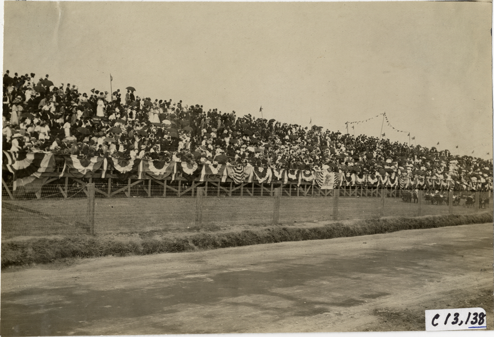 View of crowd sitting in bleachers during the 1908 Grand Prize races in Savannah, Georgia. Stamped on back: "Photo by N. Lazarnick, 29 West 42nd Street, N.Y., tel. 594 Bryant." Handwritten on back: "Races and racing--Grand Prize races, 1908."