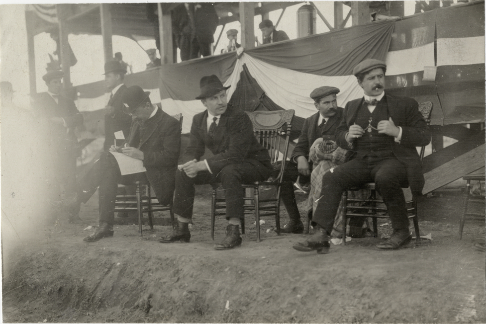 Men sitting on chairs in front of press box, 1908 Grand Prize races