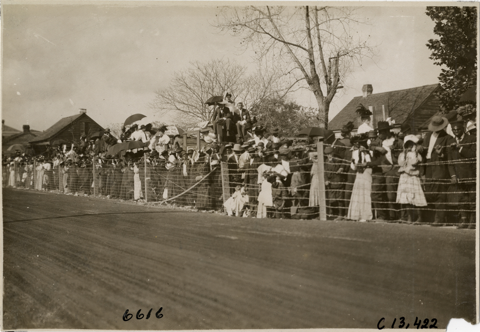 View of groups of spectators standing behind fence during the 1908 Grand Prize races in Savannah, Georgia. Wooden-frame houses in background. Handwritten on back: "Races and racing--Grand Prize races, 1908."