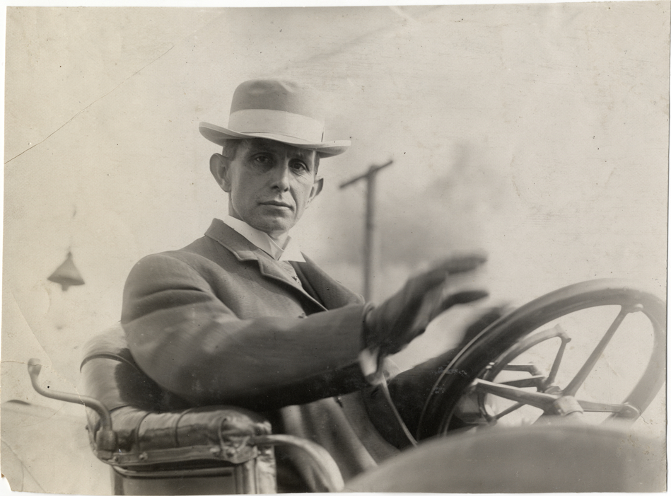 Close-up view of Harvey Granger, Chairman of the Course Committee, Savannah Automobile Club, posing in car, during the 1908 Grand Prize races in Savannah, Georgia. Stamped on back: "Spooner & Wells, Inc., photographers, telephones 3472-3473 Columbus, 1931 Broadway, New York." Handwritten on back: "Harvey Granger. Races and racing--Grand Prize races, 1908."