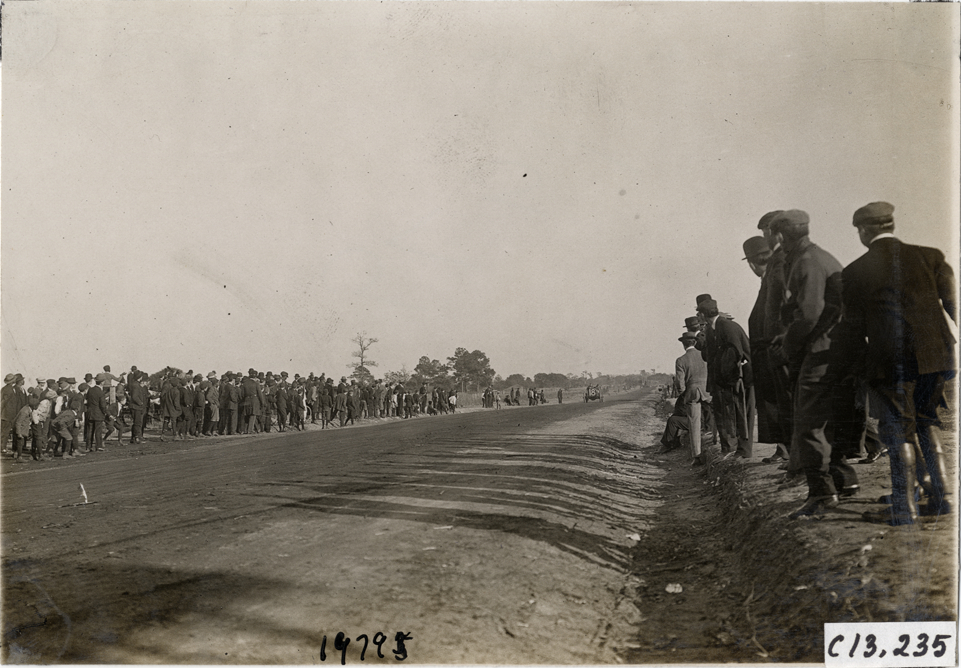 Spectators watching approaching racecar, 1908 Grand Prize races