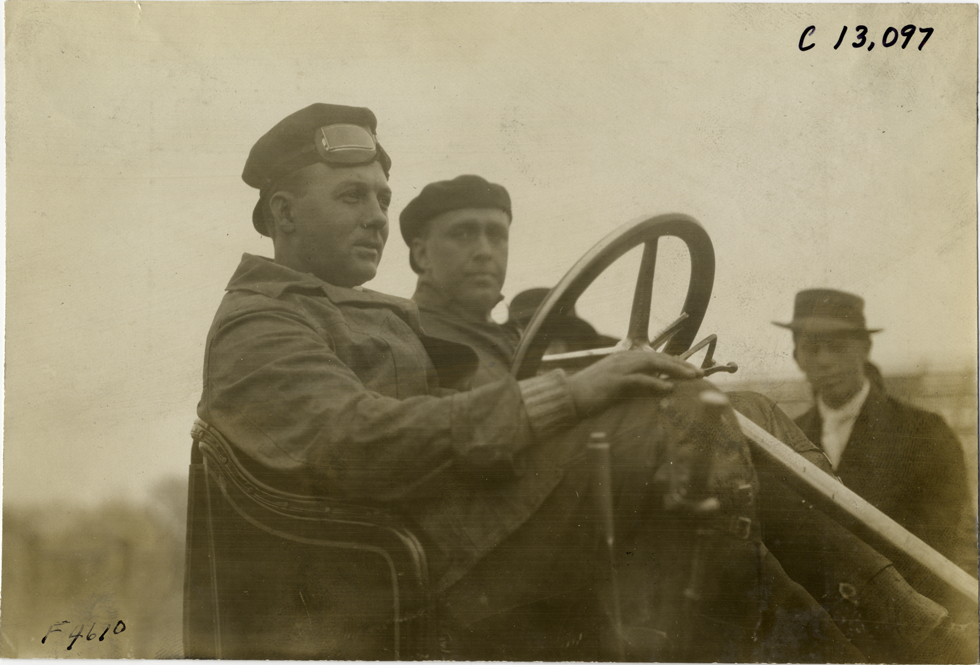 Frank Leland and passenger in Stearns racecar, 1908 Grand Prize races
